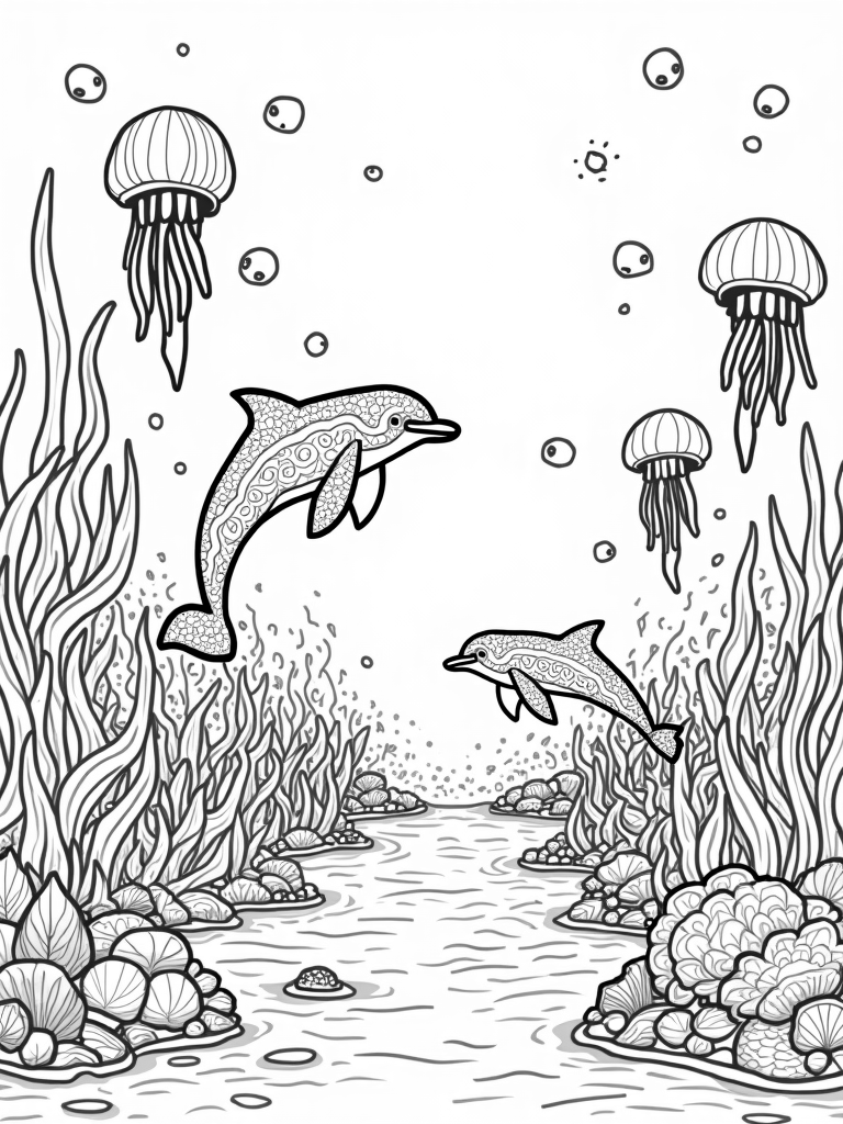 Underwater Garden with Dolphins and Jellyfish Coloring Page