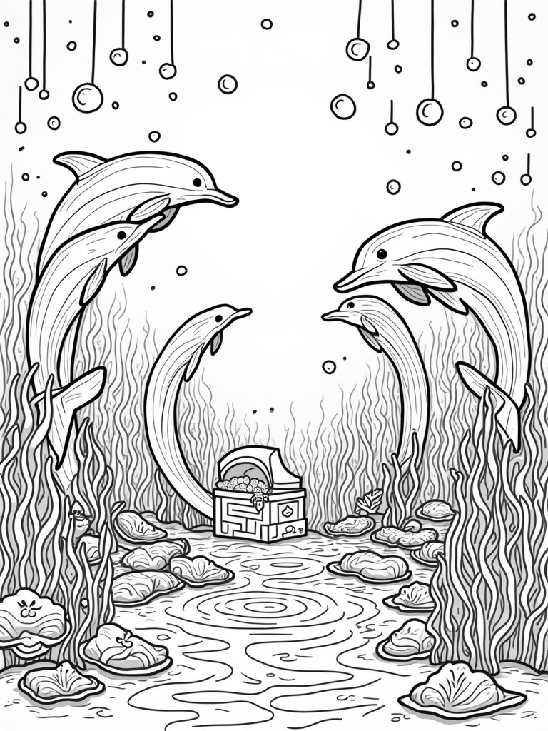 This coloring page showcases a lively underwater garden where dolphins are having a blast, leaping through colorful coral arches that look like musical notes. It's like a concert for the ocean! The currents swirl around a shimmering seaweed forest, making it feel like a magical underwater world.