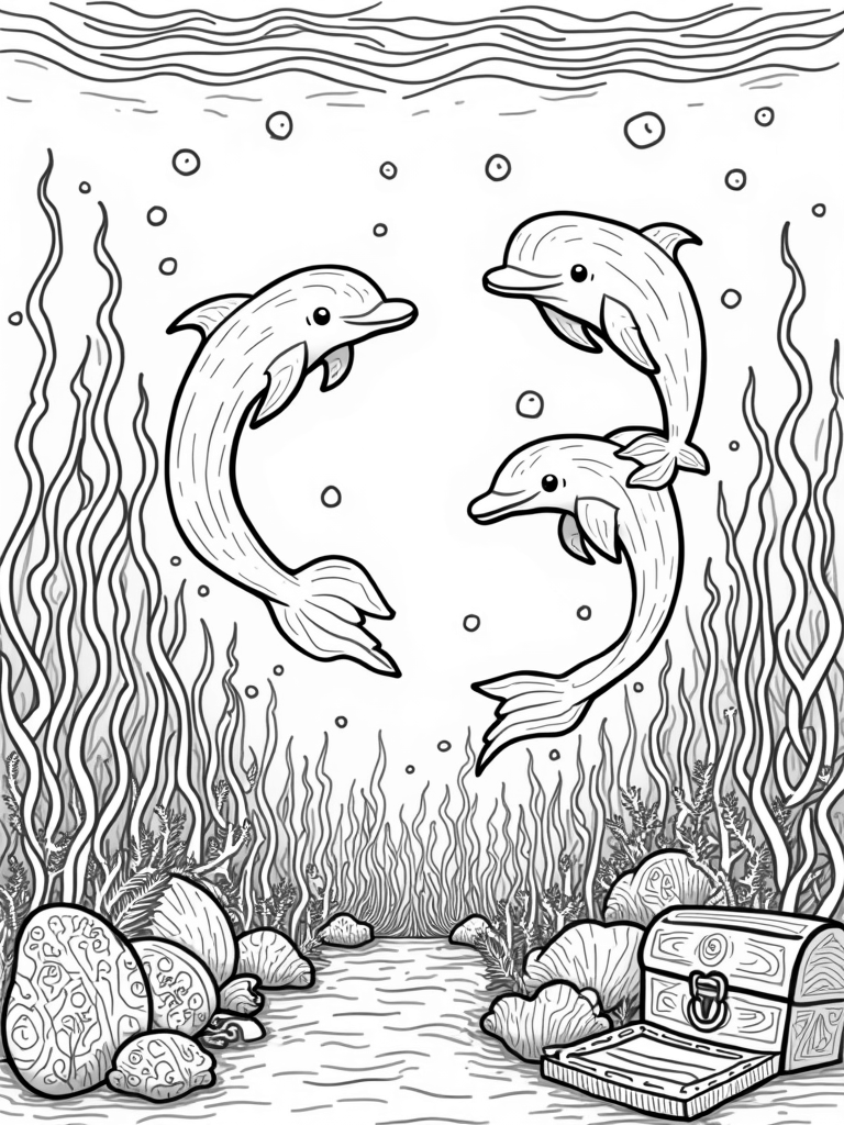 Check out this free, printable coloring page featuring an underwater garden filled with dolphins, seashells, and a treasure chest. Perfect for kids who love exploring the ocean world while having fun coloring!