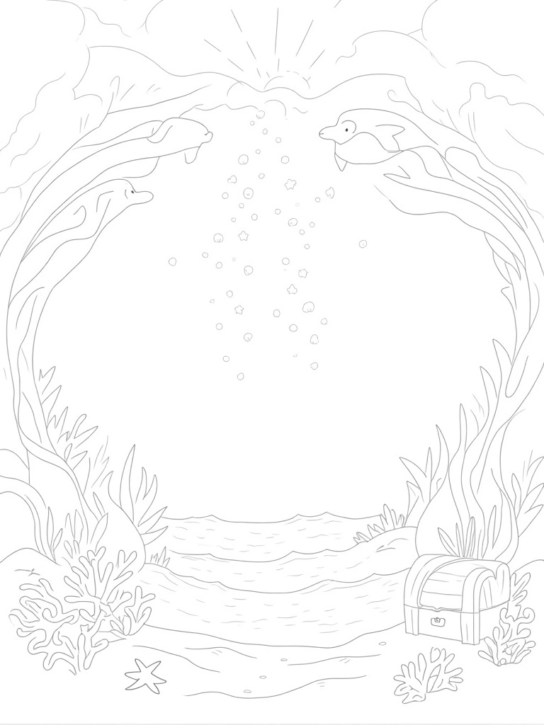 Underwater Kelp Forest with Playful Dolphins and Coral Reef Coloring Page