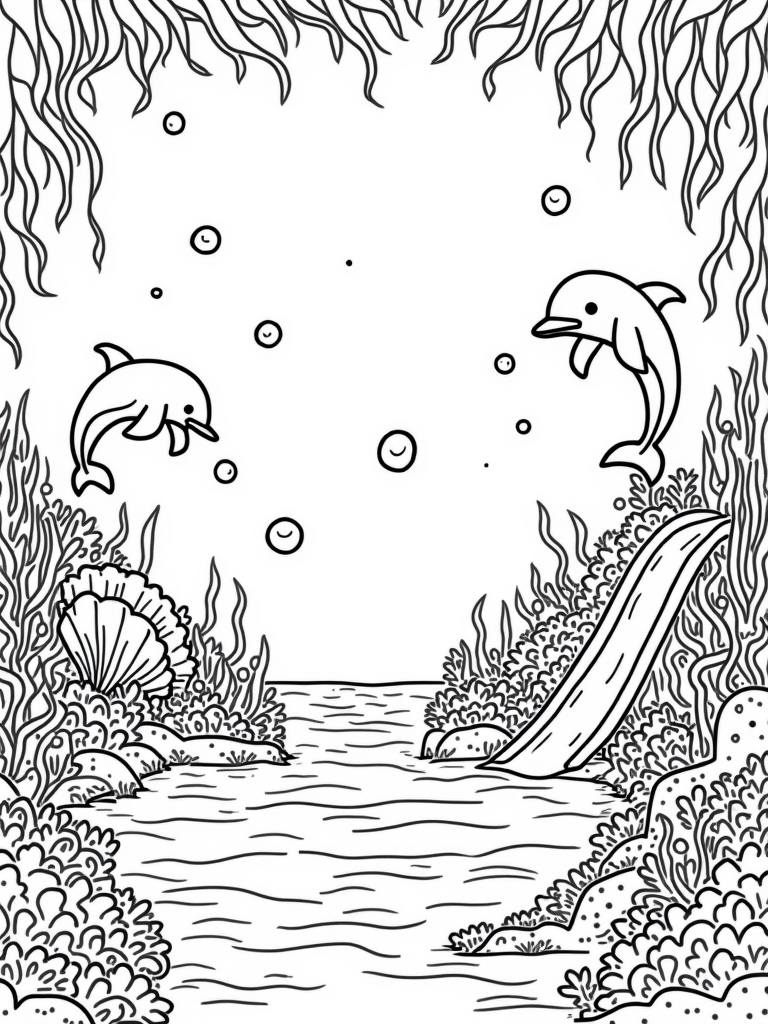 You’ll find a vibrant underwater playground filled with playful dolphins leaping over sparkling bubbles! These little guys are having a blast, and around them, beautiful coral reefs bloom in intricate patterns, looking like a magical underwater garden. There’s even a giant seashell acting as a slide, perfect for some fun underwater playtime!