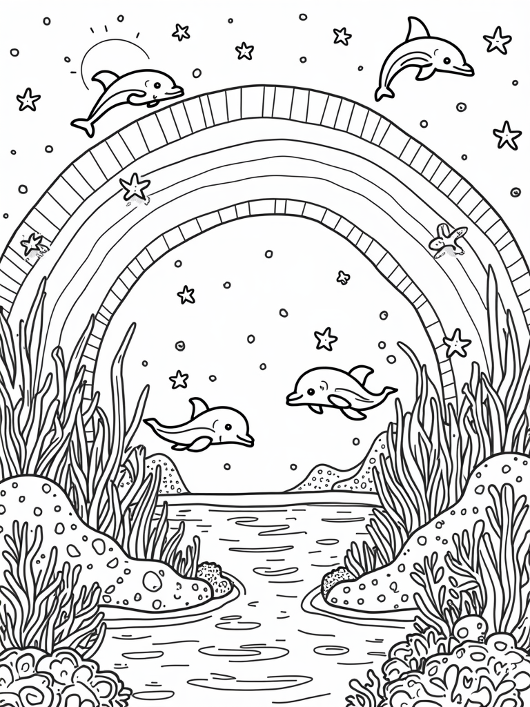This vibrant underwater scene is bursting with life! Dolphins are leaping joyfully through sparkling waves, while colorful coral reefs create playful arches all around. You can spot starfish lounging on the reef and swaying seaweed dancing in the gentle currents. It’s a lively playground where the sea creatures come to play!