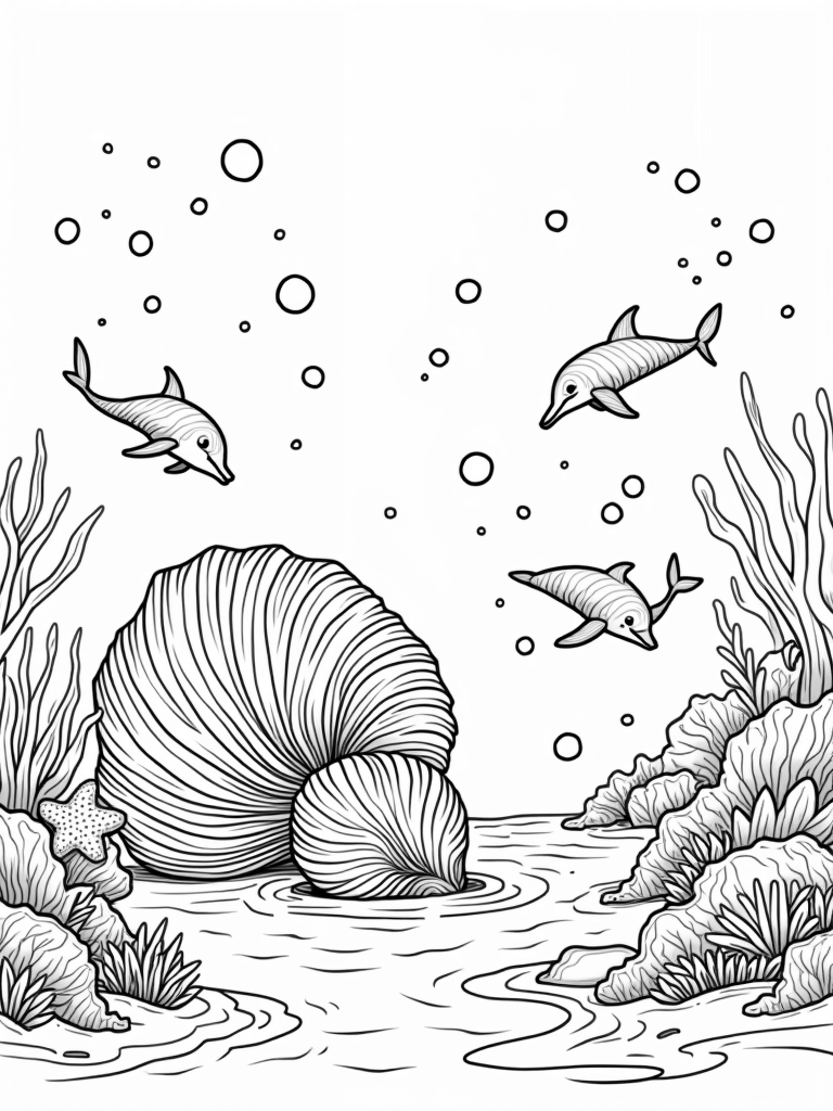 Underwater Serenity with Dolphins and a Giant Seashell Coloring Page