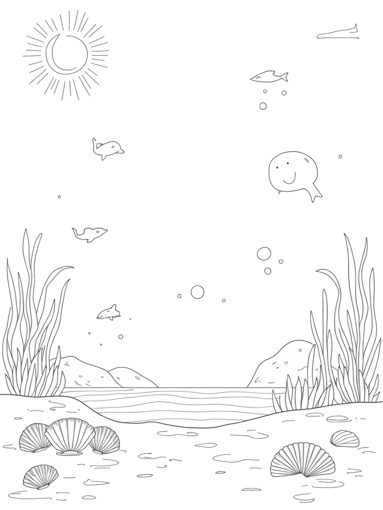 Imagine a peaceful underwater scene where a giant coral reef looks just like a musical note! Playful dolphins swim around it, jumping and twirling through the water. Sunbeams filter down from above, creating a magical glow over colorful seashells scattered on the sandy ocean floor. Nearby, a forest of whimsical seaweed sways gently, while bubbles rise in a rhythmic dance. It’s a lively and vibrant underwater world waiting for your colors!