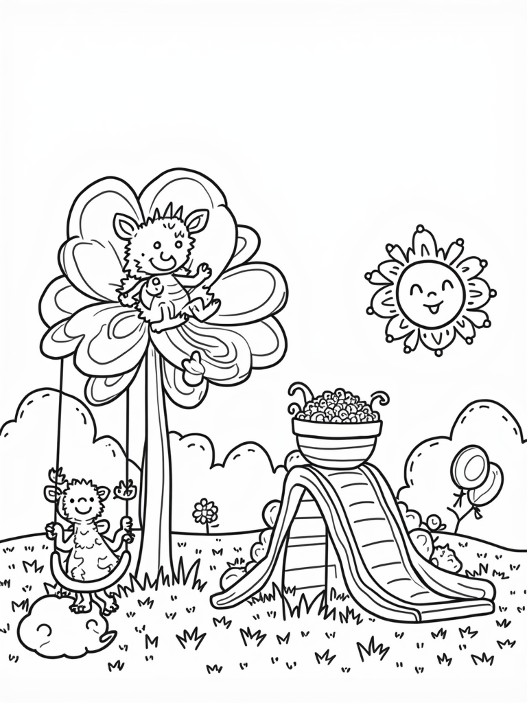This playful scene captures chubby dragons having a blast in their very own playground! One dragon is swinging from a giant flower petal, soaring high with a big smile, while another zooms down a bright, curvy rainbow slide. Nearby, a whimsical seesaw shaped like a dragon balances perfectly on a fluffy cloud, with shiny gems sitting in a basket underneath, just waiting to be discovered.
