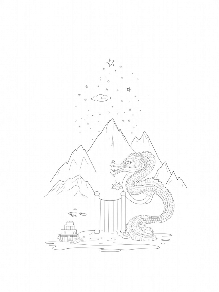 Above all this wonder, a crescent moon hangs low in a sky filled with stars. Some of those stars even form a constellation that looks just like a dragon! It’s a perfect backdrop for this enchanting scene, giving it a dreamy vibe. Kids can get creative with their colors—imagine what shades you’d use for the dragon, the sky, and the mystical ruins!