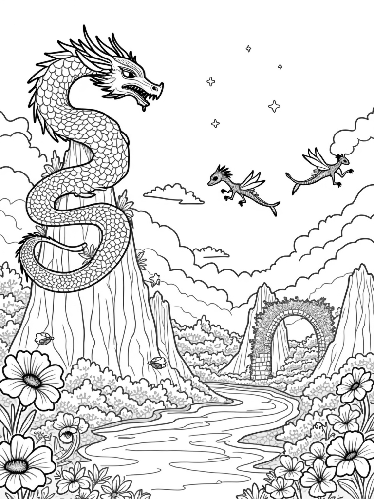 This scene showcases a massive dragon wrapped around a jagged mountain peak, its scales sparkling with intricate stained glass-like patterns. Below, you'll find a gentle river winding through a vibrant valley filled with giant flowers that look like they're straight out of a fairy tale. On one side, an ancient stone archway, draped in vines, hints at a secret cave waiting to be discovered.
