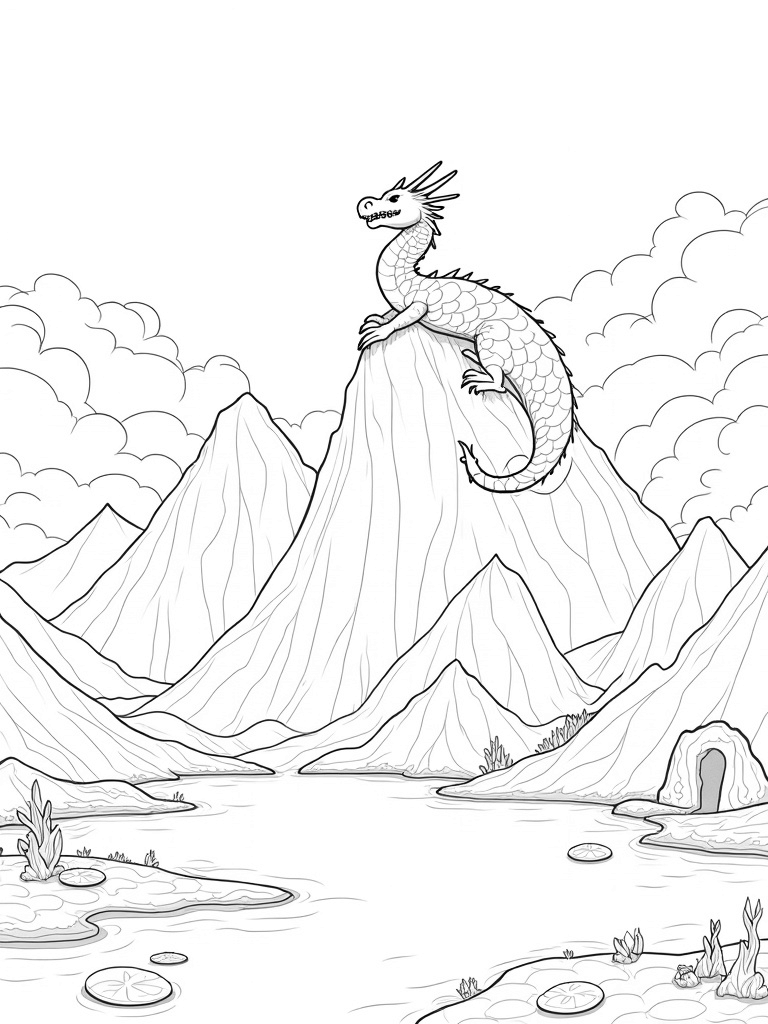 At the edge of the lake, ancient stone pillars rise up, decorated with cool dragon designs that tell stories of old. Nearby, a hidden cave sends wisps of smoke curling into the air, hinting at secrets waiting to be discovered. What do you think could be hiding inside? This scene is packed with imagination and wonder, perfect for adding your own splash of color!