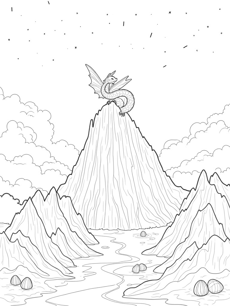 Crystal Mountains with a Fire-Breathing Dragon Coloring Page