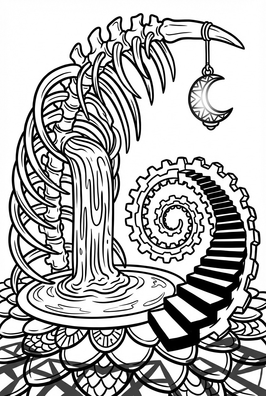 Look at this crazy scene – a giant crystal arch built from a dragon’s ribcage, its spiky backbone holding a river of molten amber that splashes into a shiny, mirrored pool. Next to it, a dragon tail made of little gears winds down into a spiral staircase of black‑obsidian steps. Hanging from a single long fang is a moon‑shaped lantern that throws neat geometric shadows over a floor covered in oversized dragon‑scale tiles. The whole thing is drawn in bold, simple lines, so it’s easy for little hands to color.