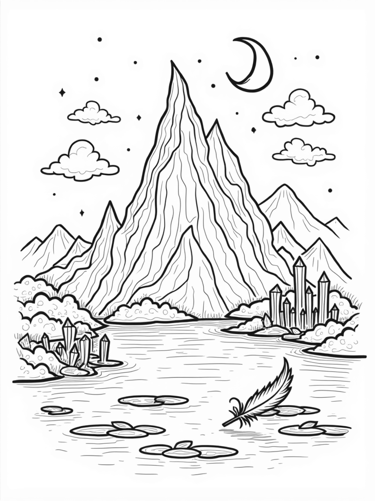 At the water's edge, a group of sparkling crystals rises up, each one shaped differently, adding a touch of wonder to the scene. And look closely! A single feather drifts on the lake's surface, hinting that the dragon might be nearby. It's a great little detail to color in!