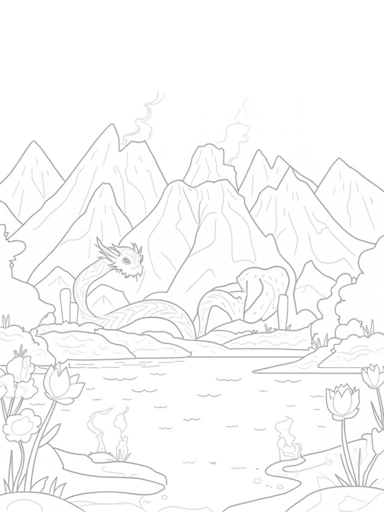 Dragon Peaks and Serene Lake Scene Coloring Page