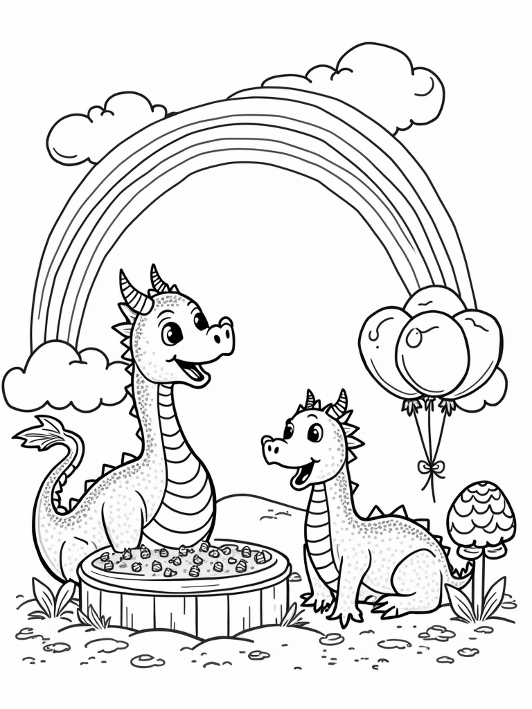 Look closer at the beautiful balloons shaped like dragon eggs, gently floating nearby. They're tied to a bright, cheerful flower, adding even more charm to this magical playground. And don’t forget the big, bright rainbow that arches overhead, bringing all the colors together in one happy scene. It's a perfect place for kids to let their imagination soar!