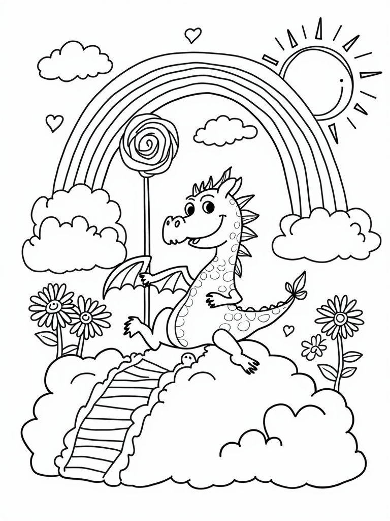 Imagine a playground high in the clouds where friendly dragons come out to play! You’ll see a cheerful dragon swinging from a sparkling rainbow, its tail playfully wrapped around a giant, colorful lollipop. Nearby, there’s an exciting dragon-shaped slide that spirals down from a fluffy cotton candy hill. It looks like the perfect place for all those adventurous little dragons to have a blast!