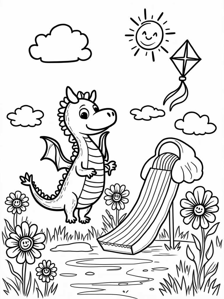 As you color, look out for the oversized flowers scattered around. Each one has a smiling face, and they’re just as cheerful as the gentle sun shining down from above. The sun beams a friendly smile, brightening up the whole scene. And don’t miss the colorful kite shaped like a dragon flying high, trailing ribbons that dance in the wind. It’s a perfect day for some outdoor fun!