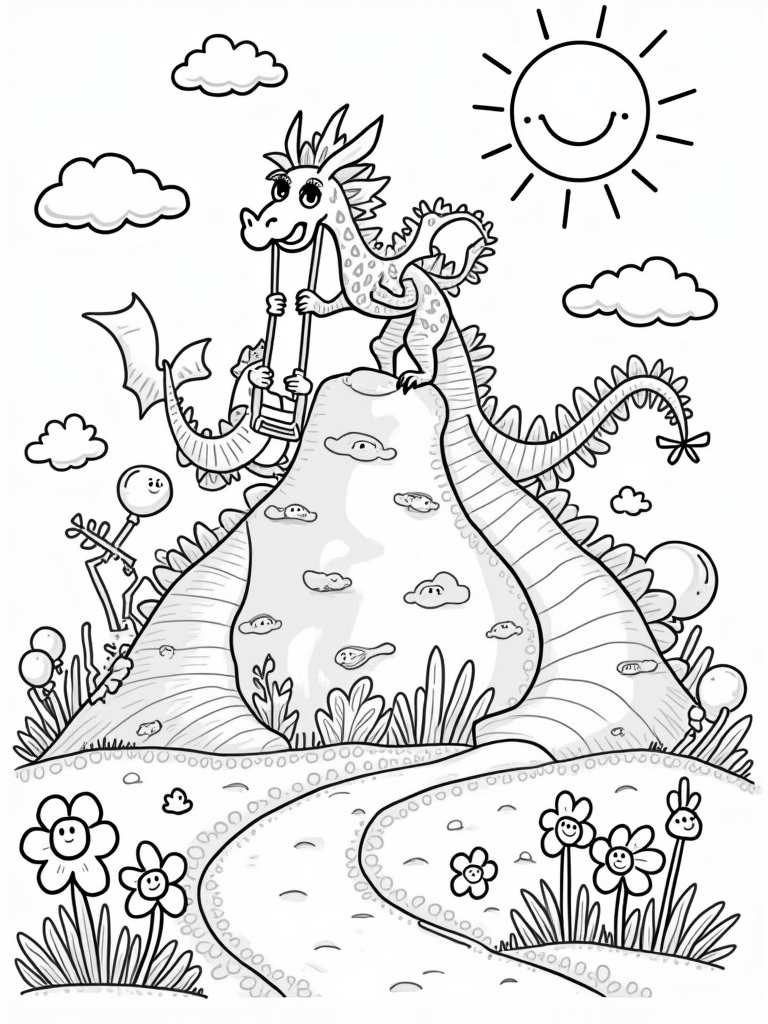 Imagine a playground where dragons play among fluffy clouds! Here, a friendly dragon swings from a rainbow-colored vine, its scales glimmering with fun patterns. Nearby, there’s a fantastic dragon-shaped slide spiraling down a hill made of soft cotton candy. How cool is that? And don’t forget the giant balloons floating around, some shaped like dragon eggs, adding to the playful atmosphere!