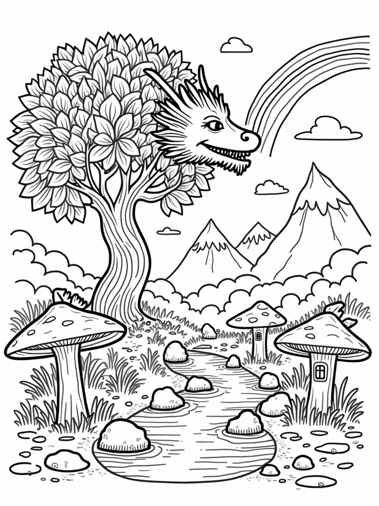 Color your own magical world with this free, printable coloring page featuring a dragon-shaped tree, colorful leaves, playful fish, and whimsical mushrooms. Perfect for kids who love dragons!