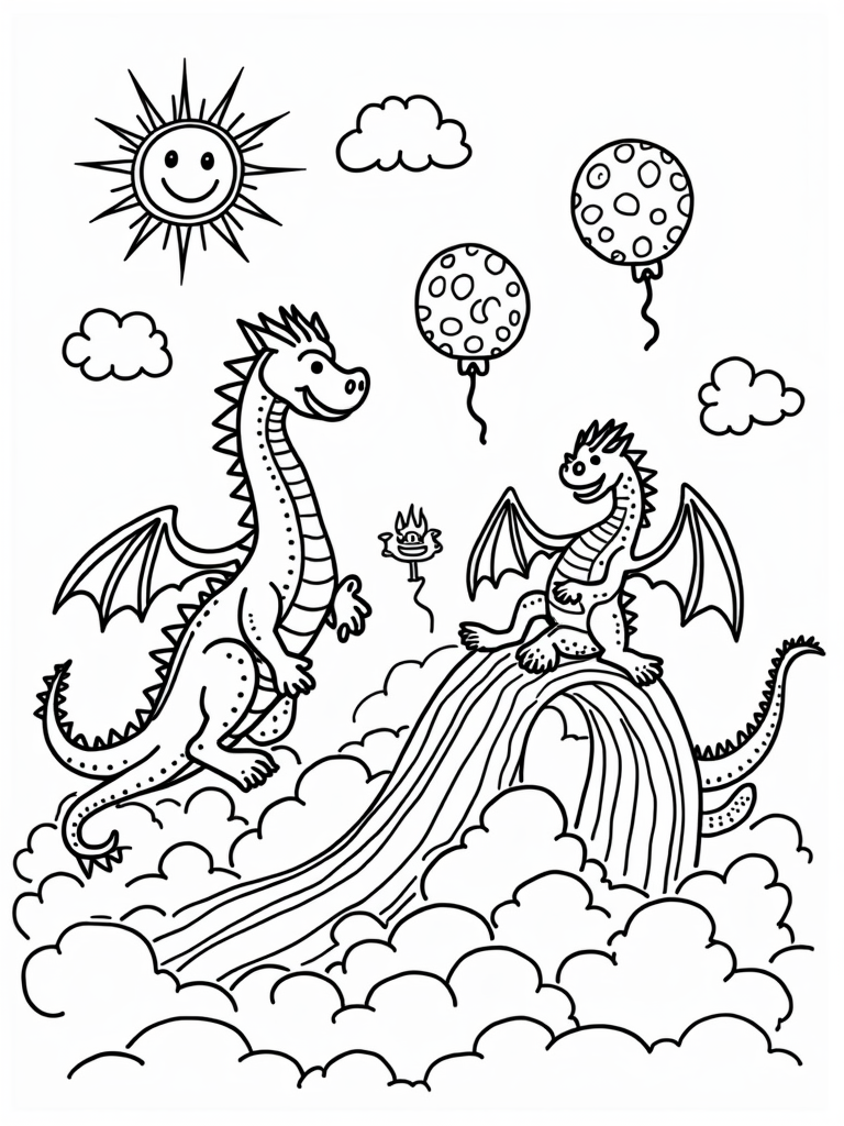 Nearby, there's a towering candy cane seesaw waiting for two little dragons to hop on. Imagine them giggling as they bounce up and down! The sun, made of smiling gemstones, shines brightly above, casting a warm glow over everything. And look at those floating balloons shaped like fire-breathing dragons! They add a splash of color and whimsy to this magical playground in the sky.