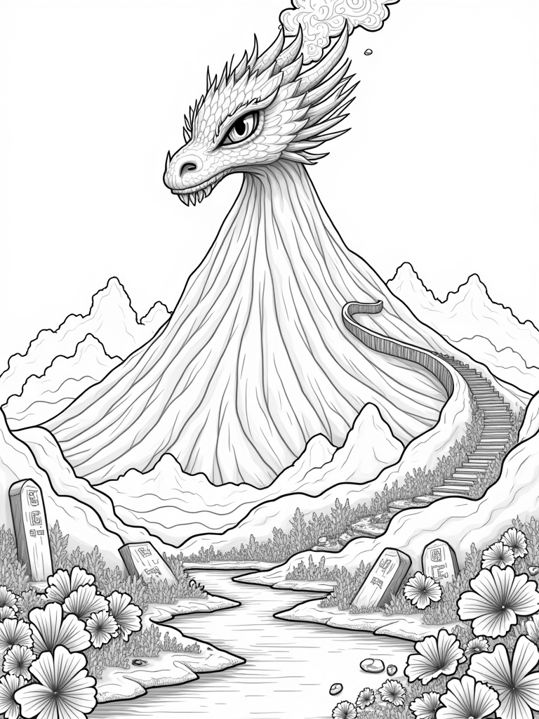 On one side of the peak, there are ancient stone tablets etched with mysterious runes. What secrets could they hold? On the other side, a spiral staircase made of dragon wings leads up into the clouds, hinting at something magical just out of reach. This coloring page invites you to let your imagination run wild as you add color to this enchanting world.