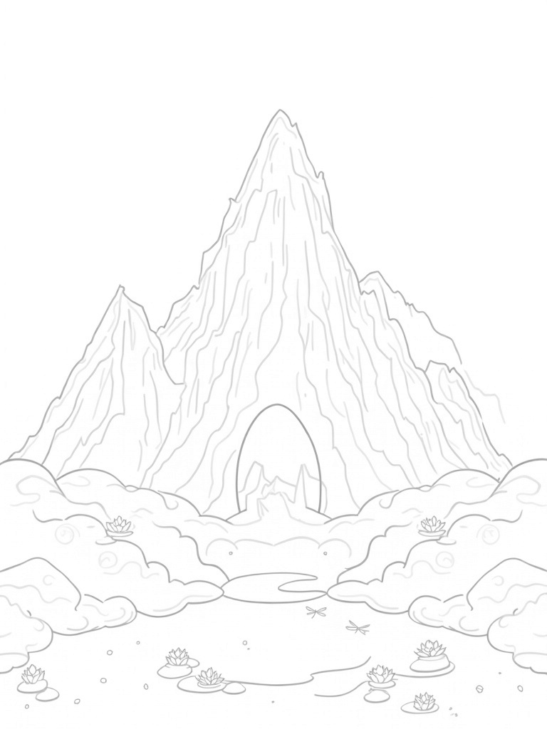 Below the mountain, there's a beautiful tranquil lake that perfectly mirrors the majestic scene above. Dotted across the water are lovely floating lotus flowers, and they look just like dragonflies ready to take flight. It’s such a peaceful spot, perfect for coloring in all your favorite shades!