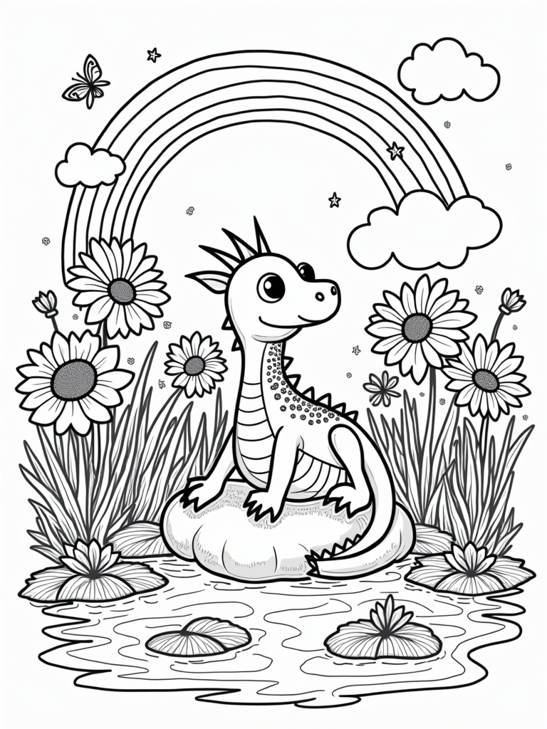 Just nearby, there's a beautiful pond that reflects the dragon's playful tail as it dips into the water, creating lovely ripples. The pond is home to giant lily pads where cheerful butterflies flutter around, making the whole place feel alive with color and joy. And let’s not forget the rainbow that arcs overhead, bringing an extra splash of brightness to this delightful garden.