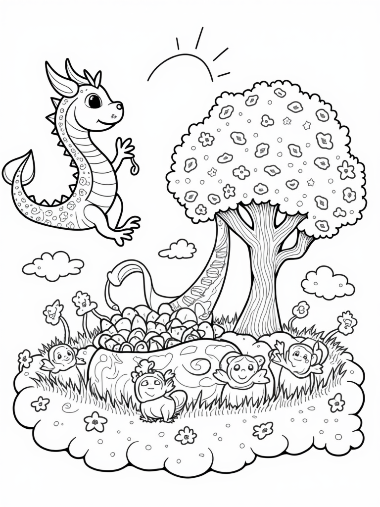 The background features a shining sun peeking through cotton candy clouds, creating a warm and inviting atmosphere. It’s the perfect day for dragons to play and explore their whimsical surroundings. Kids will love bringing this enchanting playground to life with their favorite colors, making each baby dragon and candy tree unique!