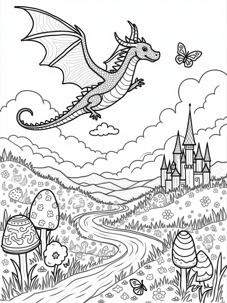 In the foreground, fluffy clouds have formed into the shapes of dragon eggs nestled in the grass. How cool is that? Butterflies flutter around, adding extra charm and a sprinkle of magic to the air. This scene is perfect for unleashing your creativity – just imagine all the colors you can use!