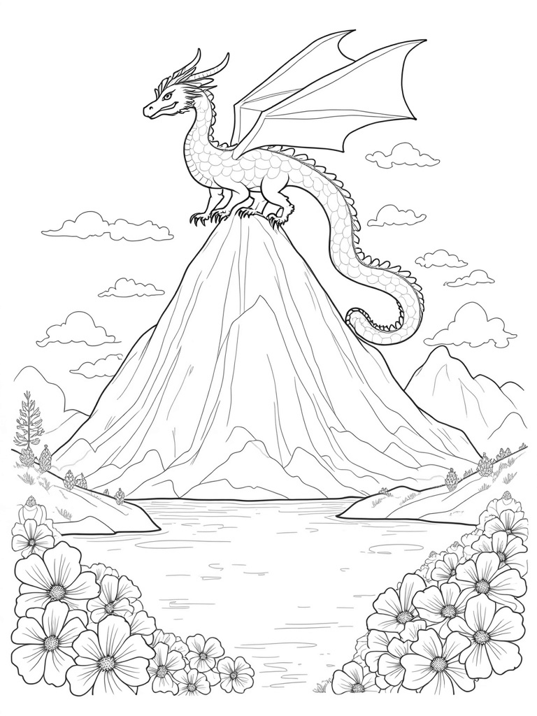 Majestic Cloud Dragon Over Mountain Lake Coloring Page