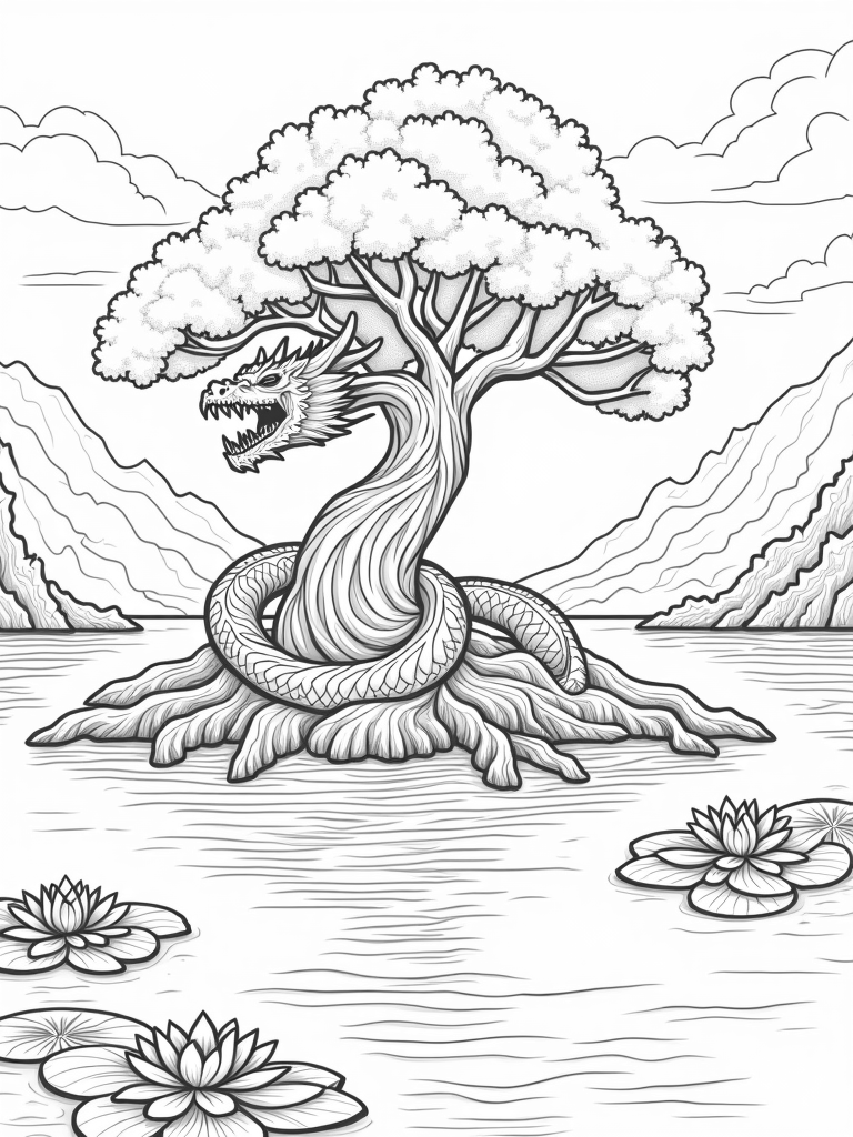 Imagine a peaceful mountain lake that mirrors a sky full of swirling clouds. In the center, a grand dragon wraps around an ancient tree, its gnarled roots dipping into the water. The dragon’s scales are decorated with beautiful patterns, and its wings stretch out like a delicate canopy above. Nearby, sparkling rocks rise from the lake, while a gentle waterfall creates lovely ripples on the surface.