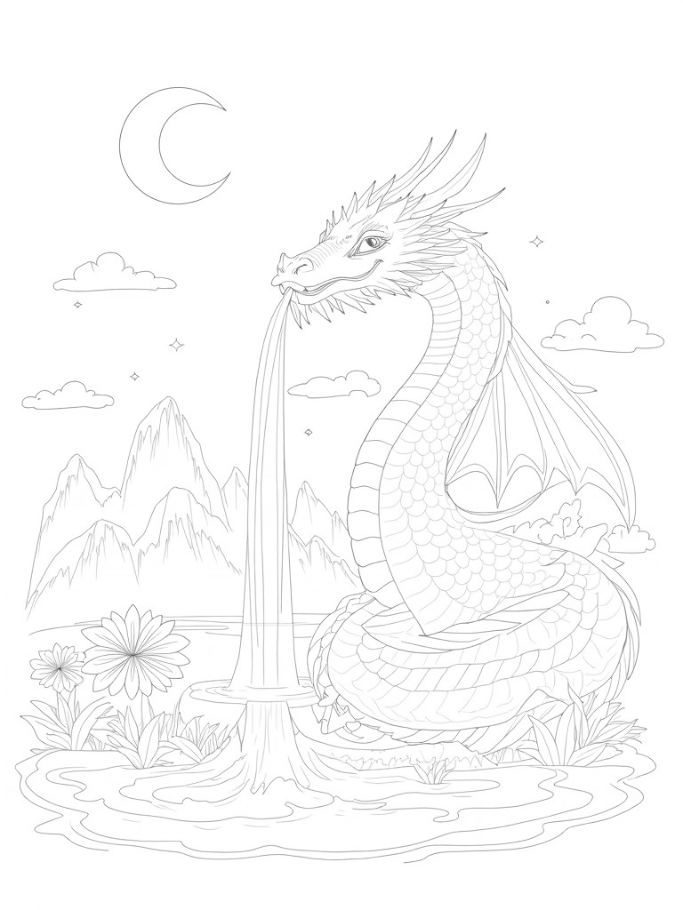 In this amazing scene, a colossal dragon wraps itself around a sparkling crystal mountain, its beautiful scales glimmering in the colors of the sunset. Waterfalls pour from the dragon's mouth, creating a peaceful lake below where little fish might like to swim. Surrounding the dragon are oversized flowers with intricate patterns, reaching for the sky like they’re trying to touch the clouds!