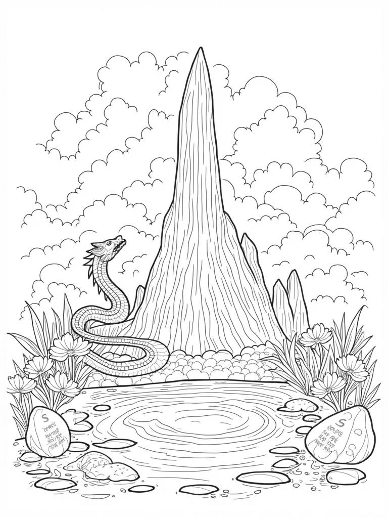 Take a peek at the serene pond nearby! It reflects the stunning mountain and dragon, and you might spot lily pads floating on the water—shaped like dragon eggs! In the foreground, ancient stones are etched with mysterious runes, whispering tales of the dragon's legendary past. Color these elements to bring them to life!
