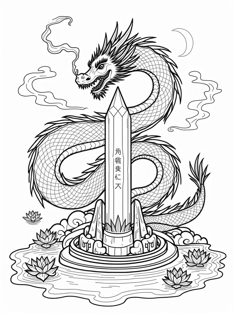 Majestic Dragon Coiled Around a Crystal Spire Coloring Page