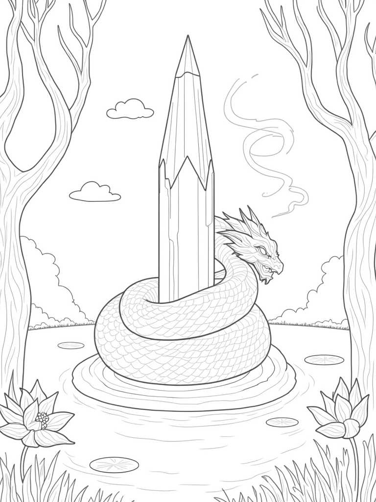On the sides, ancient trees with twisted branches add a touch of mystery, while wisps of smoke curl from the dragon’s nostrils, blending with the fluffy clouds above. And let’s not forget about the oversized flowers in the foreground, stretching their petals toward the sky, just begging to be colored in vibrant hues!