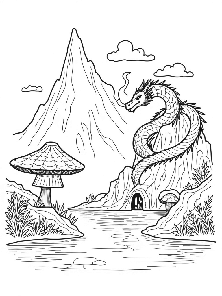 Majestic Dragon Coiled Around a Mountain Peak Coloring Page