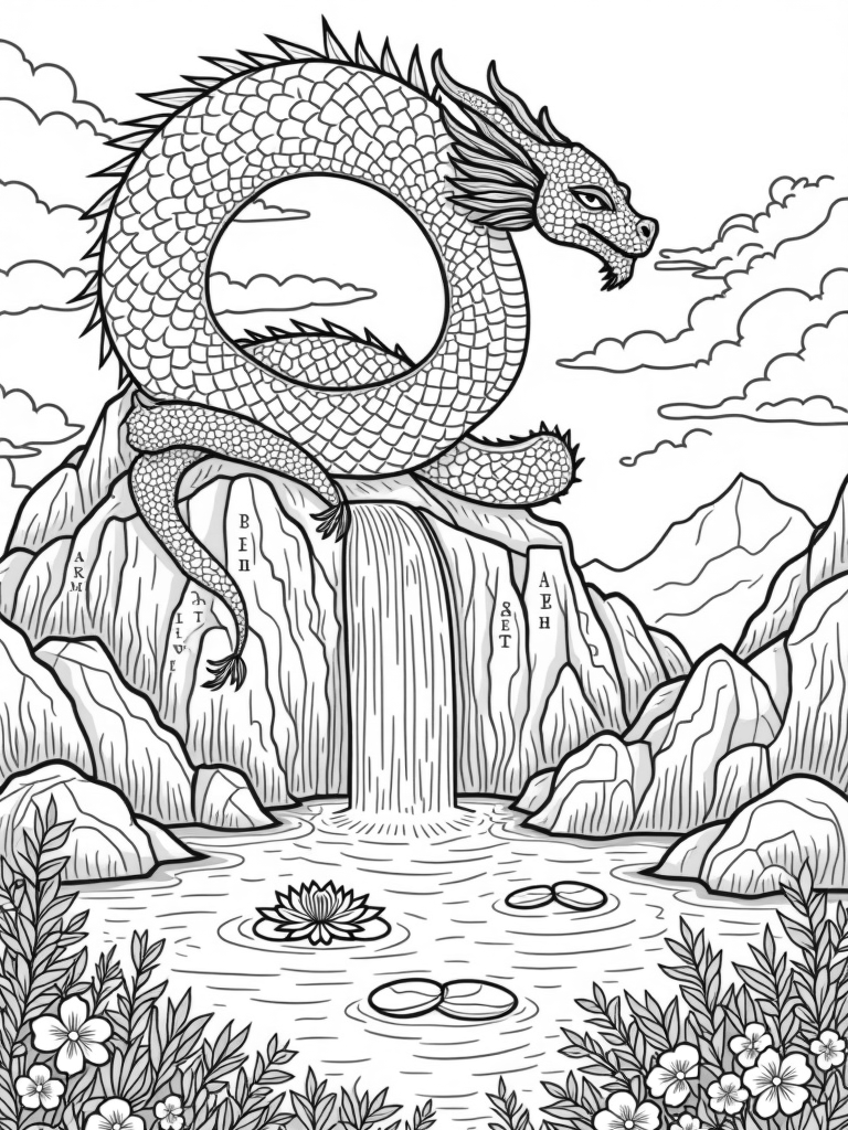 Majestic Dragon Coiled Around a Mountain Peak Coloring Page