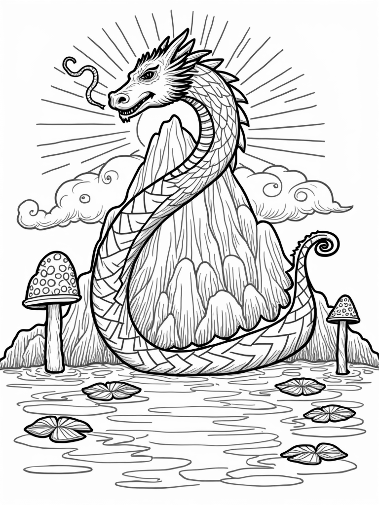 Look closely, and you’ll see wisps of smoke curling from the dragon’s nostrils, blending seamlessly with fluffy clouds that look like they’ve come straight out of a storybook. Around the mountain's base, oversized mushrooms with spiral caps add a splash of whimsy. And that sunburst pattern radiating from behind the peak? It’s casting playful shadows that invite creativity and fun!