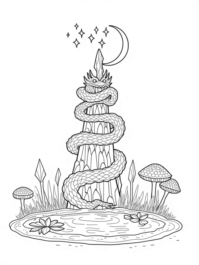 You’ll find a stunning dragon wrapped around a gorgeous spiraling tower made of emerald crystals. Its scales sparkle like stained glass, making it a real showstopper! Above it all, a crescent moon and a bunch of twinkling stars cast a soft glow over the scene, giving it that magical feel.