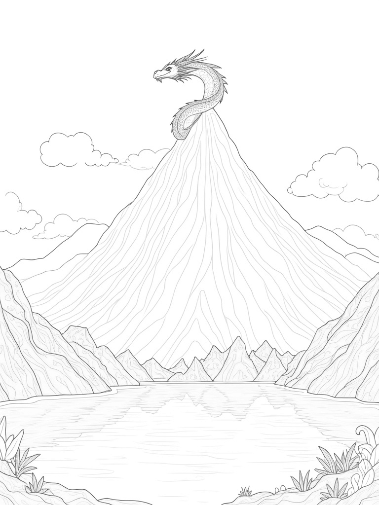 Check out this free, printable coloring page featuring a majestic dragon coiling around a mountain peak. Perfect for kids who love dragons and magical landscapes!