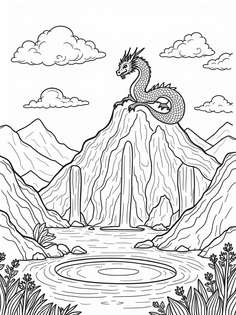 Majestic Dragon Embracing the Mountain Peak Coloring Page