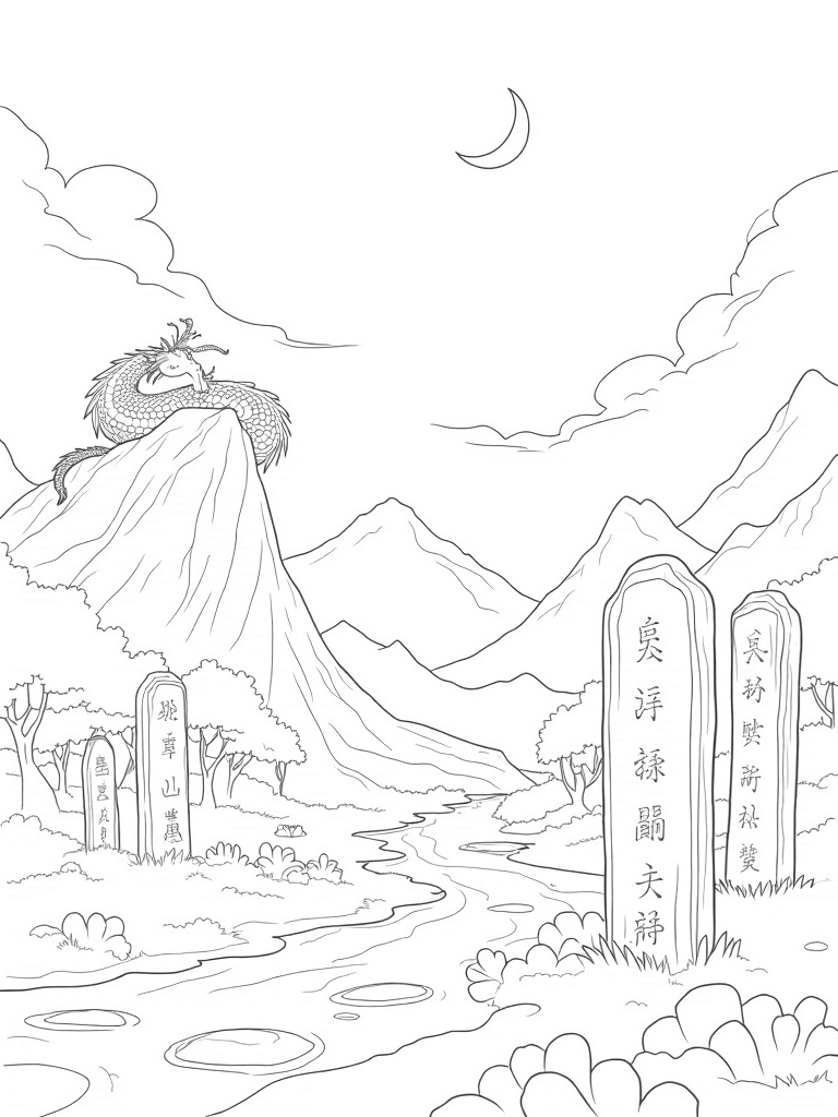 In the foreground, there are ancient stone tablets covered in mysterious dragon runes. They stand tall among a grove of twisted trees that seem to whisper secrets of old. The whole scene is illuminated by a soft crescent moon glowing above, surrounded by wispy clouds drifting lazily in the sky.