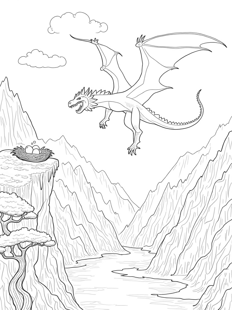 Perched high on a craggy cliff is a nest made of shimmering scales, cradling three glowing eggs. Isn’t that enchanting? Imagine what kind of dragon babies might hatch from those! Meanwhile, ancient trees with gnarled roots add an extra layer of mystery, with their leaves shaped like dragon scales. And don’t miss the floating lanterns that drift through the air, casting a soft and calming glow over the entire scene. Perfect for your next coloring session!
