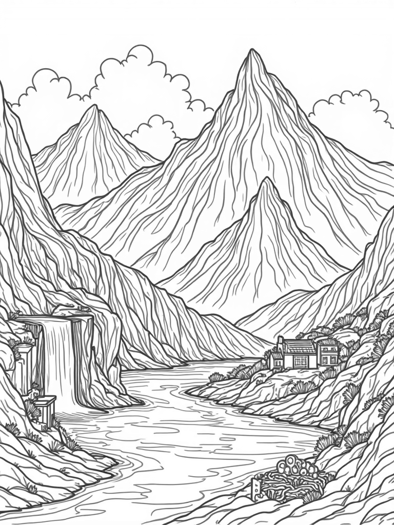Majestic Mountain Range with Dragon Wings Coloring Page