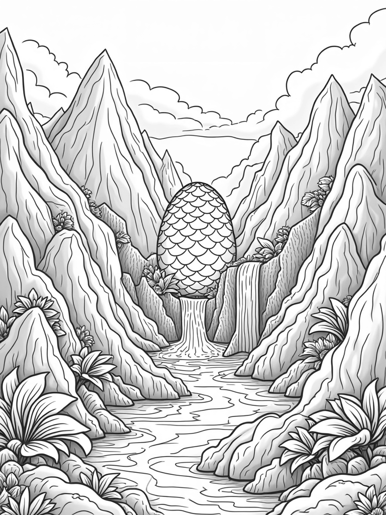 Check out this amazing scene! You’ve got a mystical mountain range where giant dragon scales create a shimmering pathway that winds through the jagged peaks. At the center, there’s a massive dragon egg resting on fluffy clouds, covered in intricate patterns that are just begging to be colored in. And don’t miss the nearby waterfall that looks like it's made of liquid silver, cascading into a crystal-clear pool that reflects the sky above.