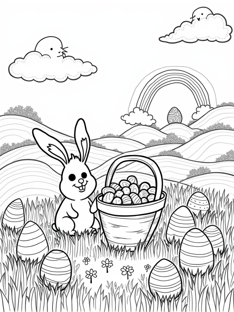 In this delightful scene, a friendly bunny relaxes in a meadow filled with giant, decorated eggs. Each egg boasts vibrant patterns that will inspire your creativity as you color them in. Around the bunny, flowers bloom in every color imaginable, creating a patchwork of beauty that makes the whole picture feel like spring.