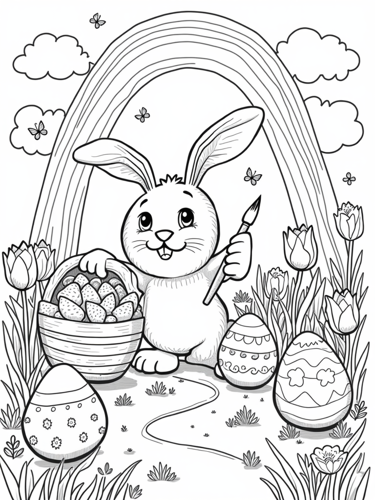 Look nearby, and you'll see a giant carrot-shaped basket overflowing with smaller eggs, perfect for all the little artists eager to color. A winding path lined with cheerful tulips leads the way to a beautiful rainbow arching across the sky, making everything feel even more magical. Fluffy clouds float lazily above, and playful butterflies flit around, adding to the joyful atmosphere.