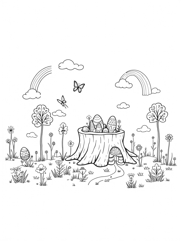 Imagine a magical meadow where everything is bigger and brighter! Here, you’ll find oversized eggs with intricate patterns hiding among vibrant flowers. Right in the center, there's a large tree stump that’s not just any stump—it’s a colorful candy factory! Jellybeans flow right out of its top, creating a sweet scene that will make your imagination soar.