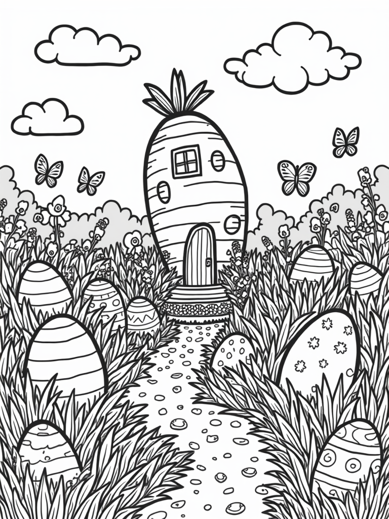 Check out this free, printable coloring page featuring a whimsical garden filled with colorful Easter eggs, a giant carrot house, and playful butterflies. Perfect for Easter fun, it's a great way for kids to express their creativity while coloring!