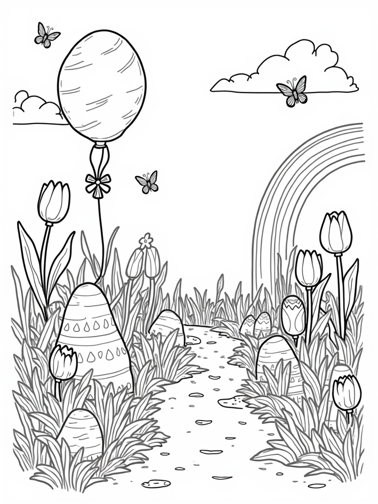 Picture a garden bursting with oversized, colorful eggs peeking out from among tall, cheerful tulips. A giant carrot-shaped balloon floats gently above, tied to a cozy patch of soft green grass. Nearby, a winding path made of chocolate crumbs leads the way to a playful bunny-shaped topiary, just waiting for a splash of color!