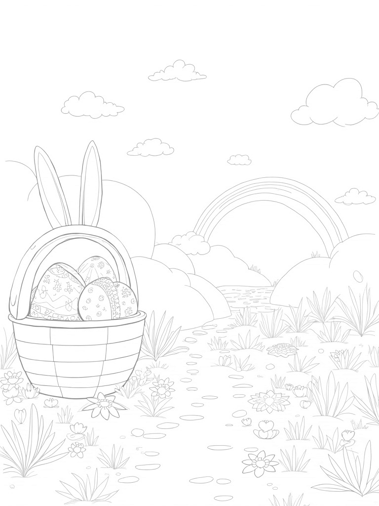 This page is all about a delightful garden scene where oversized, colorful eggs are tucked between vibrant flowers. At the heart of it, there's a giant basket filled to the brim with beautifully patterned eggs spilling out. Just imagine the fun of coloring each one differently!