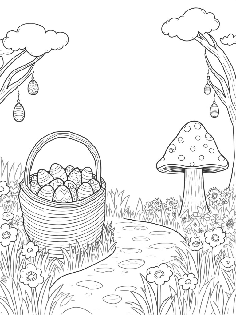 Look up and you’ll see fluffy clouds shaped like playful bunnies floating overhead, adding to the charm of this whimsical garden. There's also a nearby tree with branches that sway gently in the breeze, adorned with hanging eggs that are decorated with all kinds of fun designs. It’s a perfect spot for kids to let their imaginations run wild while coloring!